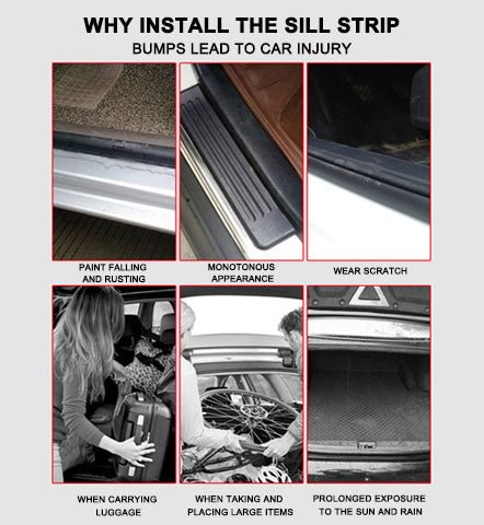 - Jellemző: A karcolásgátló ajtóküszöböt úgy tervezték, hogy megakadályozza a karcolásokat. Elfedi a meglévő karcolásokat az első és hátsó ajtók be- és kirakodása során. Jó csúszásgátló tulajdonságokkal és rugalmassággal rendelkezik. Javítsa járműve megjelenését, és tegye nagyszerűvé az autót!